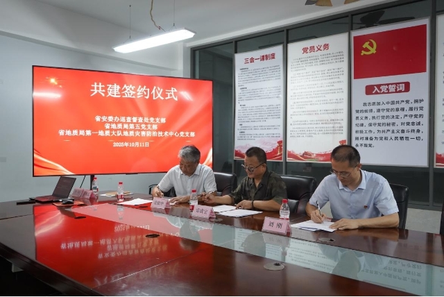 为推动党建工作与业务工作深度融合,充分发挥党建引领作用,10月11日,局机关第五党支部与省安委办巡查督查处党支部、地质一队地质灾害防治技术中心党支部开展以“党建引领聚合力 安全发展谱新篇”为主题的三方党支部共建活动。通过座谈交流、签约共建、实地调研等形式,推动三方党组织资源共享、优势互补、协同发展。