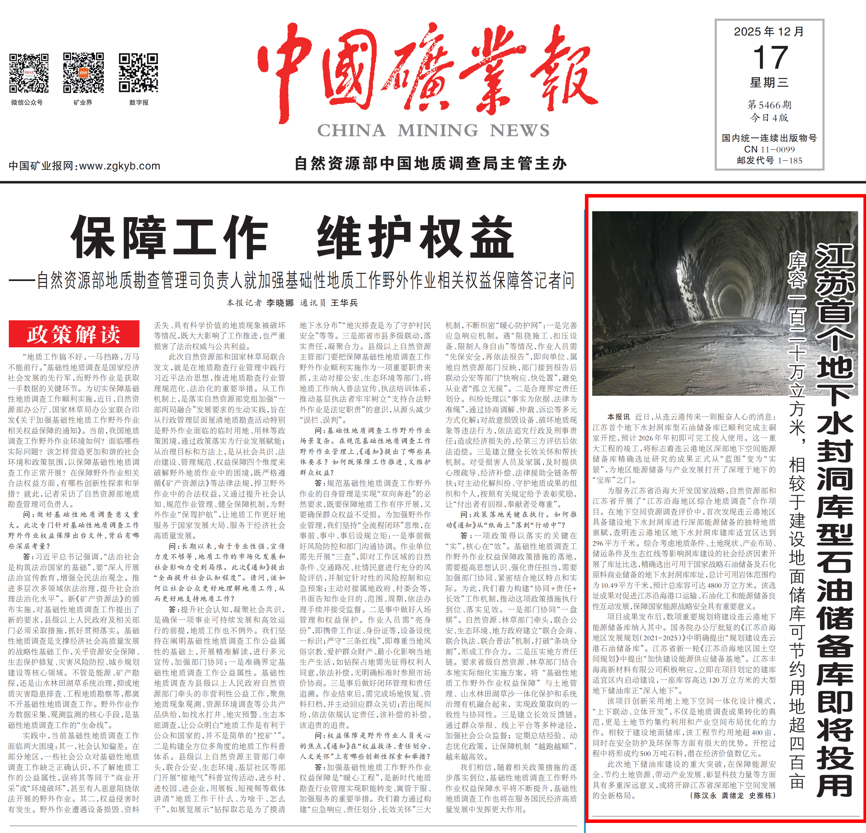 近日,从连云港传来一则振奋人心的消息:江苏首个地下水封洞库型石油储备库已顺利完成主硐室开挖,预计2026年年初即可完工投入使用。这一重大工程的竣工,将标志着连云港地区深部地下空间能源储备库精确选址研究的成果正式从“蓝图”变为“实景”,为地区能源储备与产业发展打开了深埋于地下的“宝库”之门。 为服务江苏省沿海大开发国家战略,自然资源部和江苏省开展了“江苏沿海地区综合地质调查”合作项目。在地下空间资源调查评价中,首次发现连云港地区具备建设地下水封洞库进行深部能源储备的独特地质禀赋,查明连云港地区地下水封洞库建库适宜区达到296平方千米。综合考虑地质条件、土地现状、产业布局、储运条件及生态红线等影响洞库建设的社会经济因素开展了库址比选,精确选出可用于国家战略石油储备及石化原料商业储备的地下水封洞库库址,总计可用岩体范围约为10.49平方千米,预计总库容可达4800万立方米。该选址成果对促进江苏沿海港口运输、石油化工和能源储备良性互动发展,保障国家能源战略安全具有重要意义。 项目成果发布后,数项重要规划将建设连云港地下能源储备库纳入其中。国务院办公厅批复的《江苏沿海地区发展规划(2021-2025)》中明确提出“规划建设连云港石油储备库”。江苏省新一轮《江苏沿海地区国土空间规划》中提出“加快建设能源供应储备基地”。江苏丰海高新材料有限公司积极响应,立即在项目划定的建库适宜区内启动建设,一座库容高达120万立方米的大型地下储油库正“深入地下”。 该项目创新采用地上地下空间一体化设计模式,“上下联动、立体开发”,不仅是地质调查成果转化的典范,更是土地节约集约利用和产业空间布局优化的力作。相较于建设地面储库,该工程节约用地超400亩,同时在安全防护及环保等方面有很大的优势。开挖过程中将形成约500万吨石料,潜在经济价值数亿元。 此次地下储油库建设的重大突破,在保障能源安全、节约土地资源、带动产业发展、彰显科技力量等方面具有多重深远意义,或将开辟江苏省深部地下空间发展的全新格局。(转自《中国矿业报》2025年12月17日头版) |