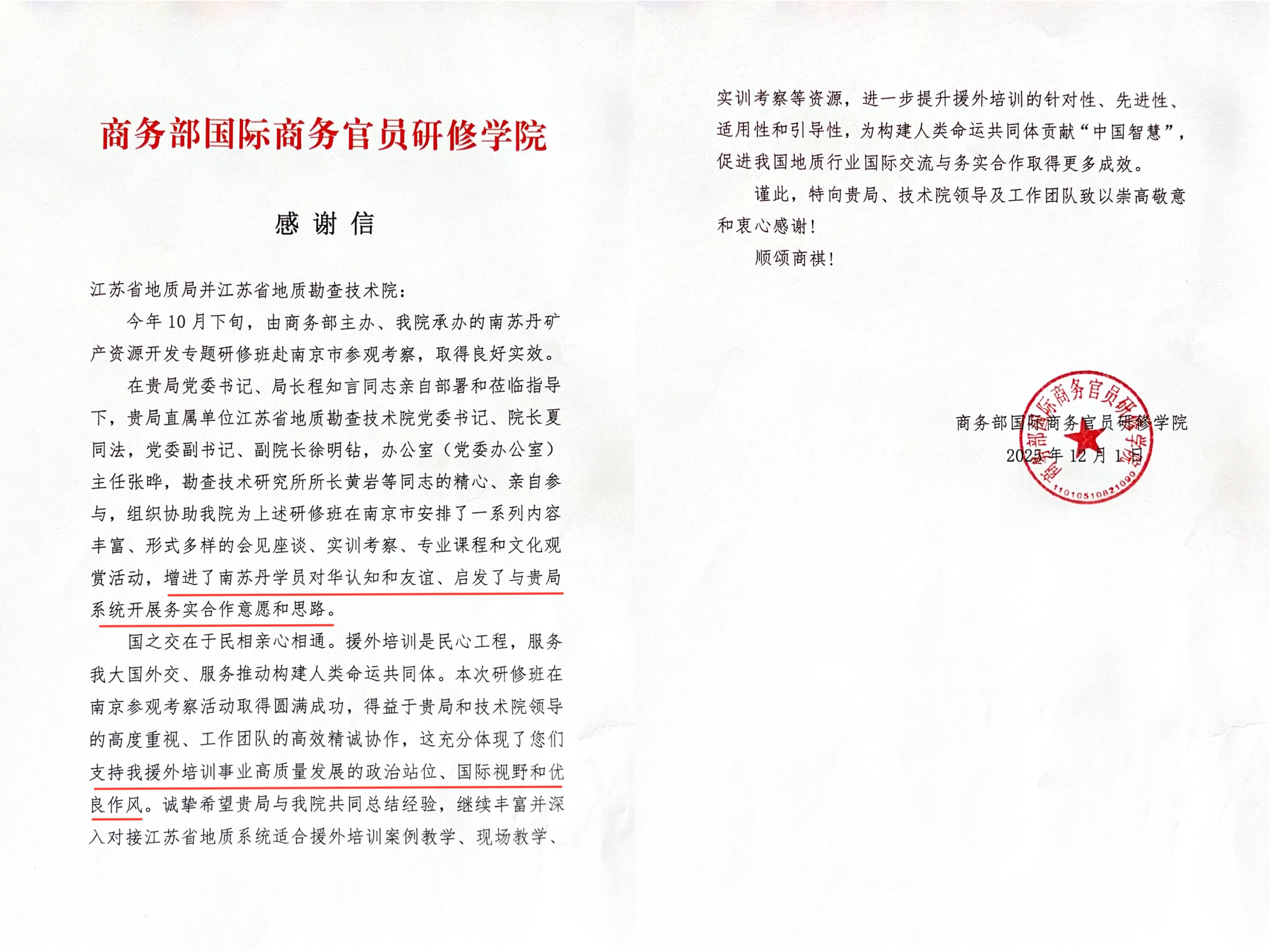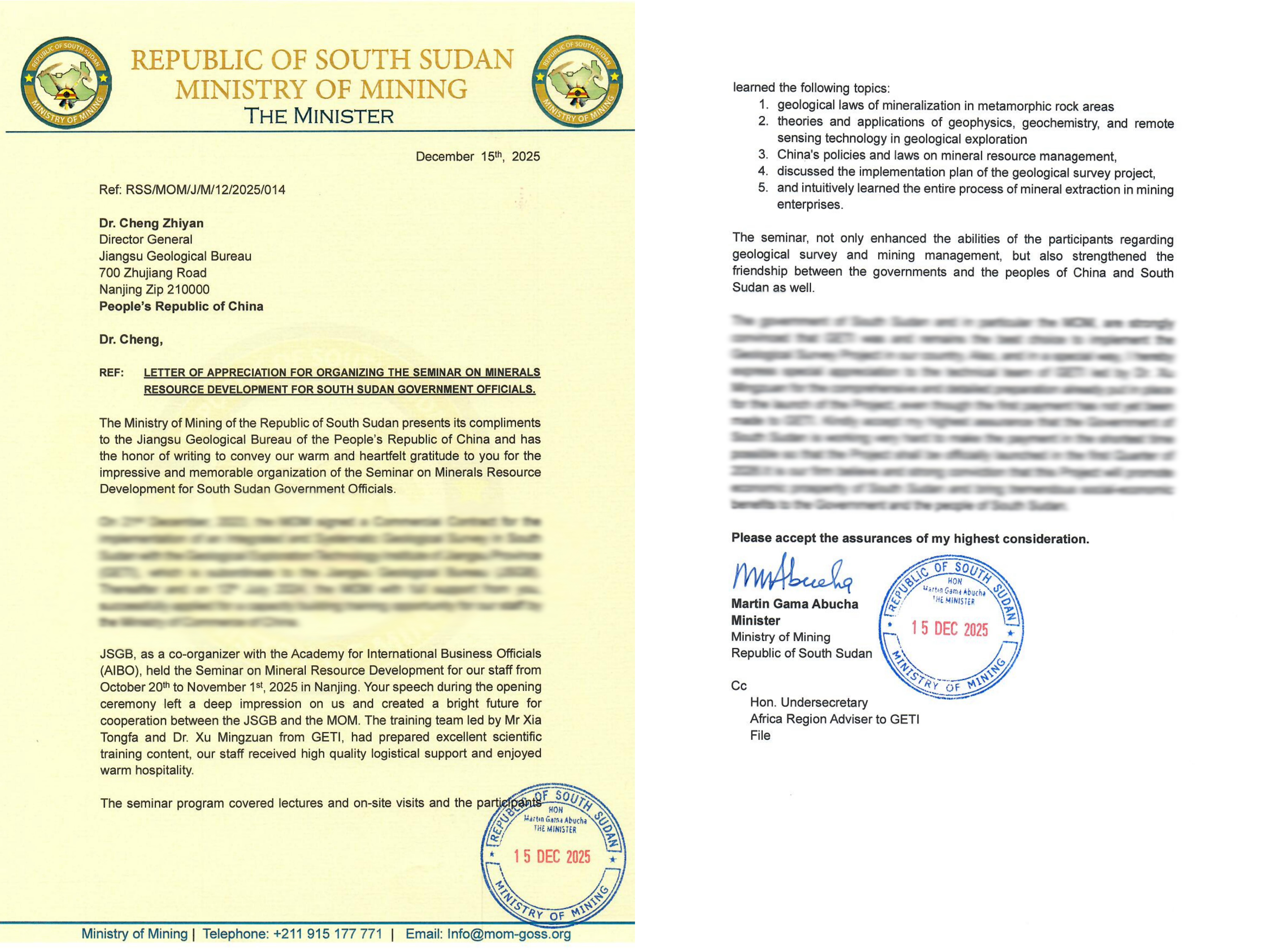 近日,省地质局及局属地勘院相继收到中国商务部国际商务官员研修学院与南苏丹共和国矿产部发来的两封沉甸甸的感谢信。这双重肯定,不仅是对省地质局成功协办“南苏丹矿产资源开发专题研修班”所展现的专业实力与高效组织能力的褒奖,更是对其积极投身国家援外事业、搭建国际合作桥梁的责任担当与务实作风的高度评价。 研修班在宁期间培训于十月下旬至十一月初顺利完成。在省地质局的统筹指导下,地勘院精心设计,为南苏丹学员打造了融“理论前沿、技术实训、现场观摩、文化体验”于一体的立体化研修体系。商务部研修学院在信中盛赞此次培训“周密细致、内容丰富”,有效“增进了南苏丹学员对华认知与友好感情,启发了其务实合作的新思路”,并特别肯定了省地质局在项目中体现出的“高站位、宽视野与优良作风”。 南苏丹矿产部的感谢信的字里行间则洋溢着对地质局专业水准与真诚合作的赞赏与信赖。信中着重感谢了专家团队精湛的业务能力和无私的奉献精神,并热切期盼未来能在相关领域开展更深层次的交流与合作。 双信共鸣,承载的是跨越国界的深厚情谊与专业敬意;一致愿景,见证的是以知识共享驱动共同发展的坚定步伐。展望未来,省地质局将继续整合优势资源,深化国际合作,带领各地勘队伍,以扎实的专业知识和丰富的实践经验,为高质量共建“一带一路”、推动构建人类命运共同体贡献坚实的地质智慧与力量!(地勘院 张晔 蔡璐) |