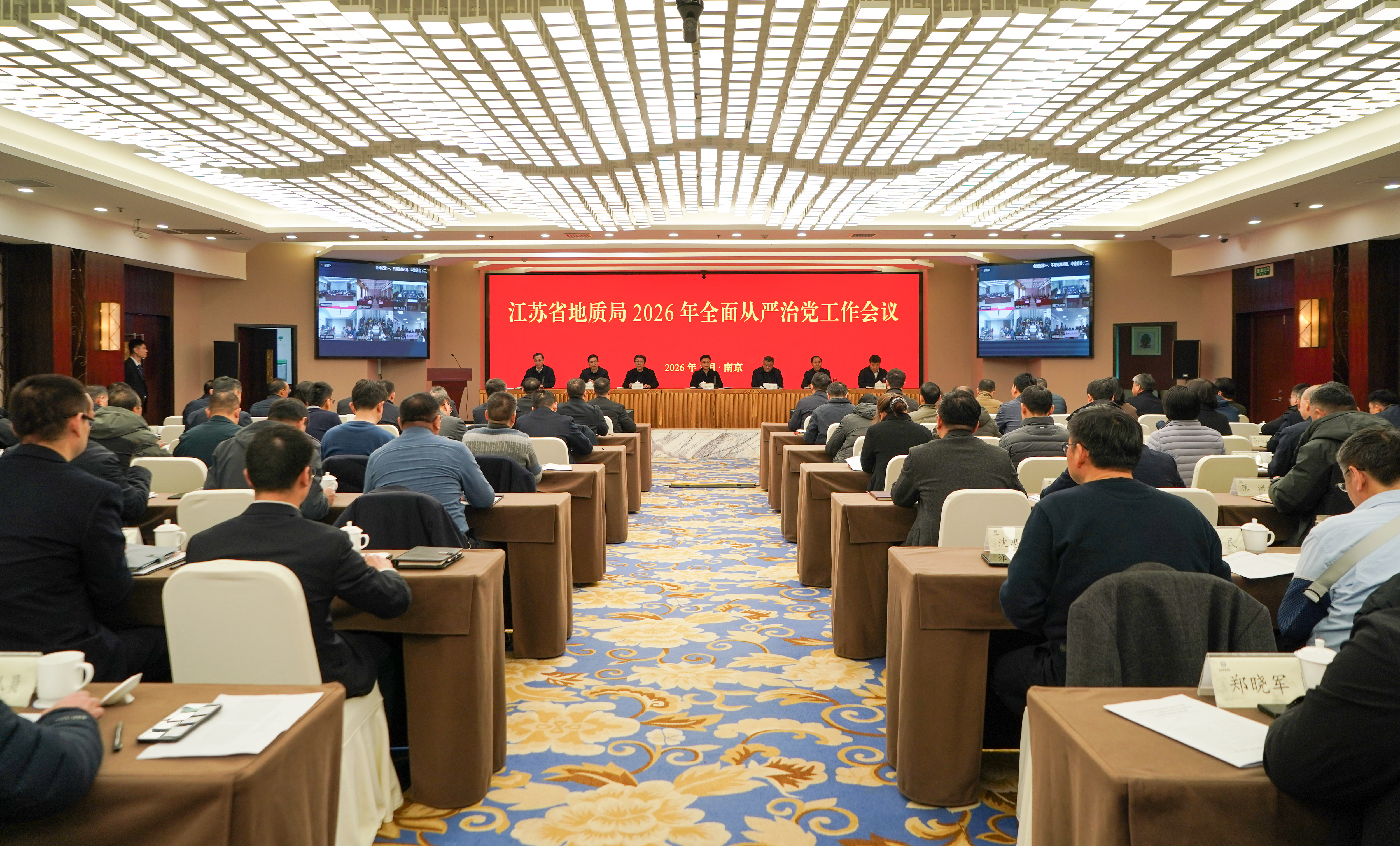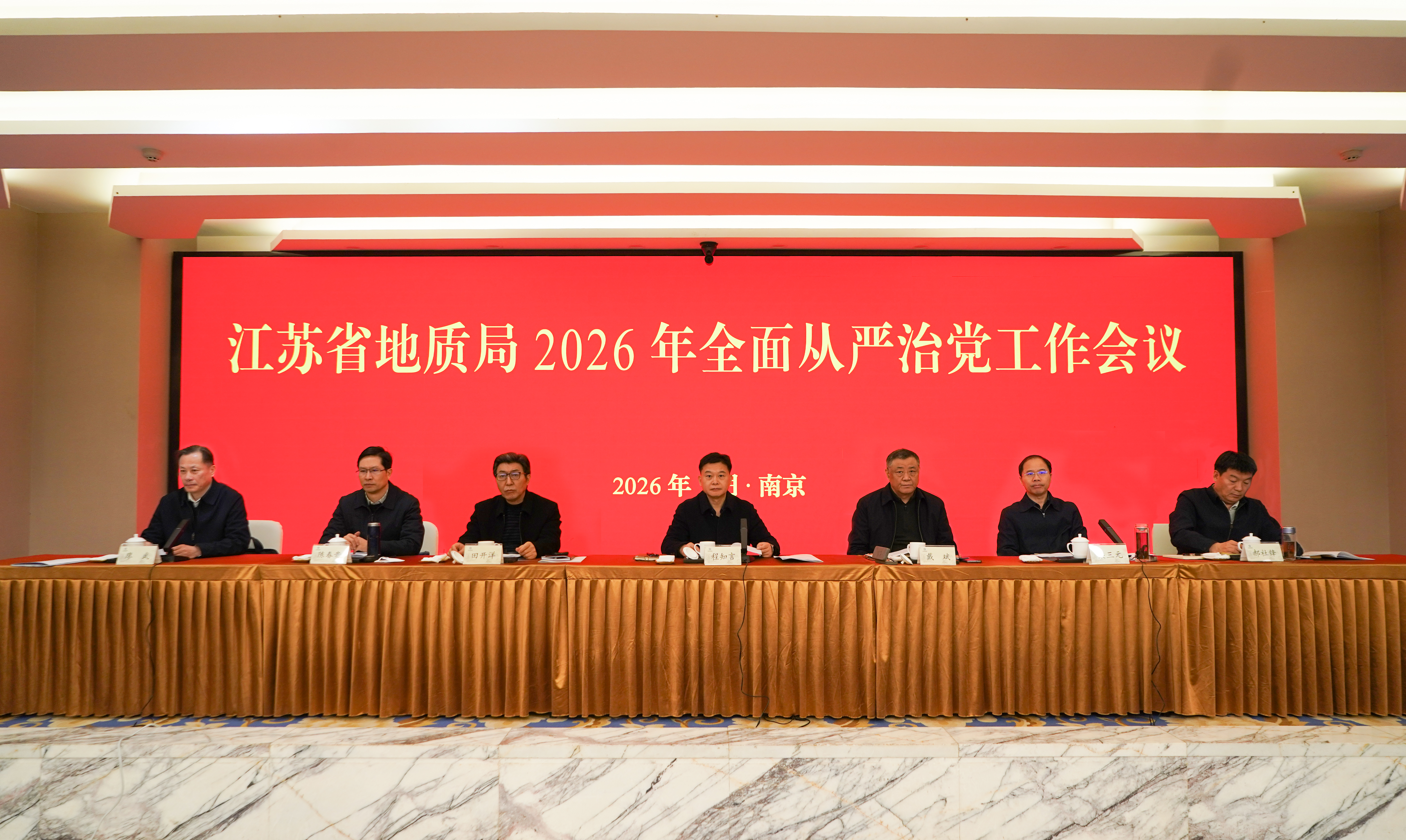 3月11日,省地质局2026年全面从严治党工作会议在南京召开。会议深入学习贯彻习近平总书记关于党的建设的重要思想、关于党的自我革命的重要思想,全面贯彻落实二十届中央纪委五次全会精神以及十四届省纪委六次全会精神,总结2025年局系统全面从严治党工作,部署2026年重点任务,动员全局各级党组织和广大干部职工以永远在路上的坚韧和执着,坚定不移把党的自我革命向纵深推进,为江苏地质凝心聚力启新程、守正创新再出发提供坚强政治保证。局党委书记、局长程知言作全面从严治党工作报告。局党委副书记梁三元主持会议并传达了十四届省纪委六次全会精神、省级机关党的建设工作会议精神。驻厅纪检监察组副组长、二级巡视员廖武出席会议并讲话。局领导班子成员出席会议。